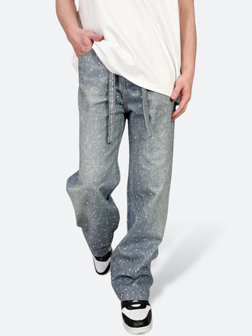 170cm 68kg M着用。キラキラと光を放つディテールが全体に施されたこのデニムは、まるで銀河の星くずをまとっているような幻想的な印象を与えます。リラックスフィットとウォッシュ加工でヴィンテージ感を演出しながら、ラインストーンの装飾がグラマラスな雰囲気をプラス。また、デニム生地と同じ素材で作られたベルト付きで統一感をプラス。ナイトアウトや普段のスタイルをワンランクアップさせるアイテムです。グラフィックTシャツやオーバーサイズのコートと合わせて、クールに決めるのも良し、フィットしたトップスとブーツでグラマラスに仕上げるのもおすすめ。ラグジュアリーストリートのファッションスタイルにハマる1本です。