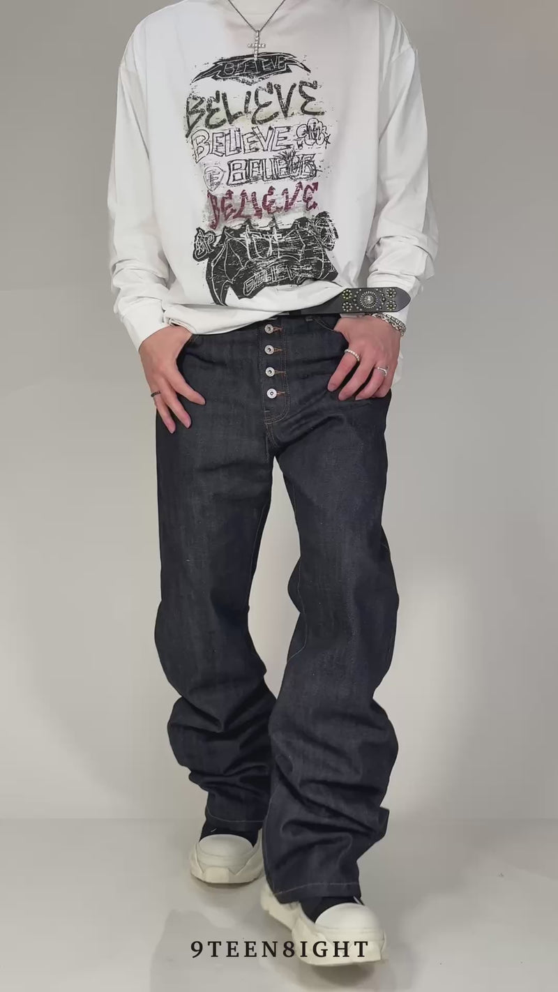 | アイテム説明 | 未加工ロウデニムを使用した、ワイド・フレアシルエットのブーツカットデニム。フロントはクラシックな5ボタン・フライ仕様、ヒップから裾までストンと落ちるようなストレート気味のフレアラインで、足元に重心を落とす構造。歩いたときに生まれる自然に落ちる広がりが特徴で、裾は過剰に引きずらず、適度なボリューム感に抑えられている設計が最大のポイント。裾幅はブーツやスニーカーにしっかりかぶさる設定で、ローテクからボリューム系のフットウェアまで対応可能。ウエスト・ヒップ周りはややフィットしつつ、膝下から大胆に広がるカッティングでシルエットのコントラストが際立つ。ハリ感のあるノンウォッシュ・コットンデニムを使用。洗い・加工なしの生デニム特有の硬さと経年変化が楽しめる一本。着用と洗濯を繰り返すごとに、自分だけのアタリと色落ちが出てくる仕様です。ロング丈グラフィックT+厚底スニーカーでY2K〜グランジ寄せでもショート丈のフーディ+ワークブーツでストリートルックでもレザージャケット+タンクトップで90sなクラブミックススタイルもハマる。足元を主役にしたスタイリングで、ワンランク上のシルエットを際立たせてみては。 |